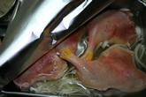 ・オーブンから取り出しストックを取り除きます。(このストックはスープを作るのに使えますので、冷やしてから上に出た油を取り除き保存してください)そのまま4時間〜1晩、皮が乾くまで置きます。これにより皮がぱりっとします。