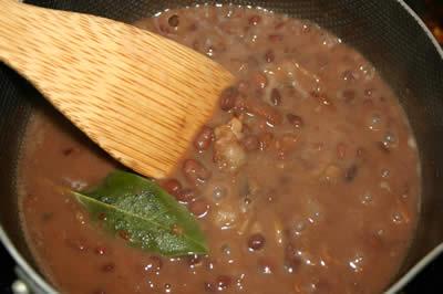 ・ブラックビーンズ、ベイリーフ、コンソメを加えます。