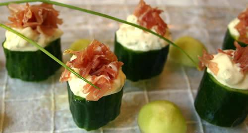 ・キュウリの中にスタッフィングを入れ、上に生ハムを飾ります。