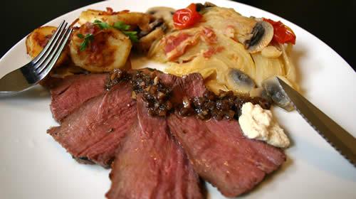 温めておいた皿に形良く肉を盛ります。ソースをかけて、ホースラディッシュを添えたら出来上がりです。