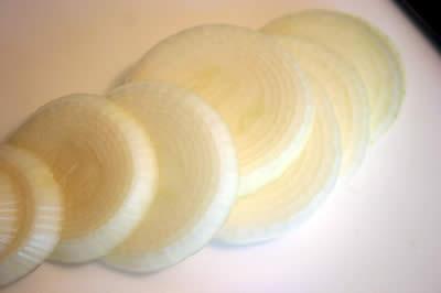 ・玉葱の皮を剥き、5mmくらいの厚さにスライスします。