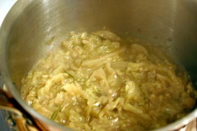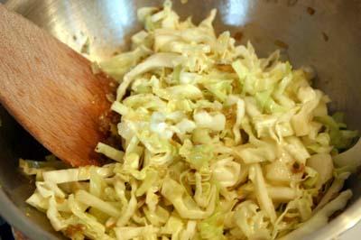 ・キャベツのみじん切り、アンチョビ、昆布茶を加えてさっと炒めます。