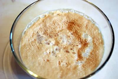 ・まずピザ生地を作りましょう。中くらいのボウルに200mlのぬるま湯を入れ砂糖を溶かします。ドライイーストを振り入れたらそのまま発酵させます。