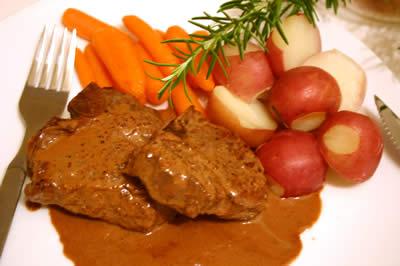 皿に肉を形良く盛ります。ソースをたっぷりかけて付け合せの野菜を添えたら出来上がりです。温かいうちにお出しします。
